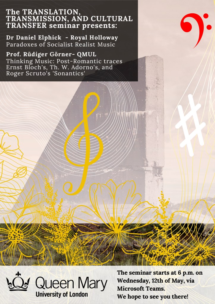 First of all, I’m giving a talk on ‘The Paradoxes of Socialist-Realist Music’ at QMUL on 12 May, as part of their ‘Translation, Transmission, and Cultural Transfer’ seminar series.